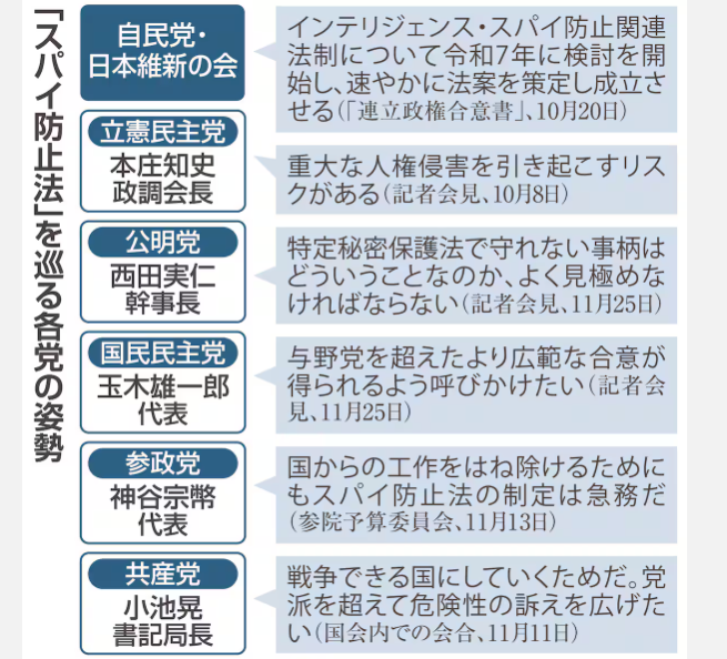 | 004 | 名無しさん | 2025/11/26(水) 09:37:32 | 参政、国民民主…野党の「スパイ防止法」提 | 画像 |