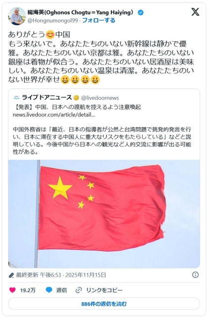 楊氏は、高市早苗首相の台湾をめぐる発言を受け、中国政府が中国国民に対し日本への渡航を控えるよう注意喚起したとする報道を引用した上で、「ありがとう中国。もう来ないで。あなたたちのいない新幹線は静かで優雅。あなたたちのいない京都は雅。あなたたちのいない銀座は着物が似合う。あなたたちのいない居酒屋は美味しい。あなたたちのいない温泉は清潔。あなたたちのいない世界が幸せ」と投稿した。