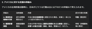 結論から言うと、現行の日本の法制度下では、アメリカが台湾関係法に基づいて台湾の防衛に出動し、それに日本が「参戦」するための直接的かつ明白な根拠法は存在しない、というのが一般的な見解です。
