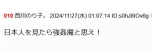 これ、西川のり子と言います。反日〇鮮〇です。曰く、「日本人を見たら強〇魔と思え!」