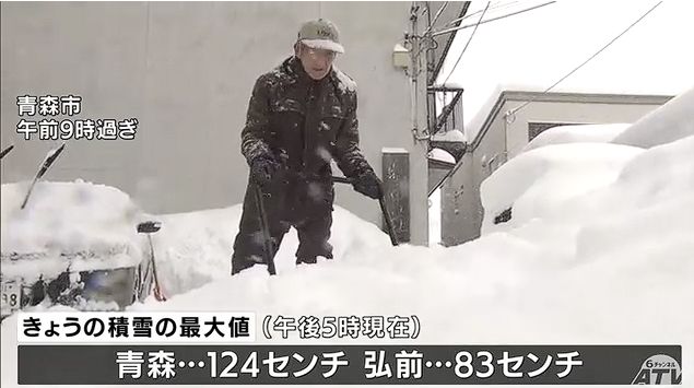 県内は各地で雪が降り続き、24日午後5時現在の積雪の最大値は青森で124センチ、弘前で83センチなどとなっています。