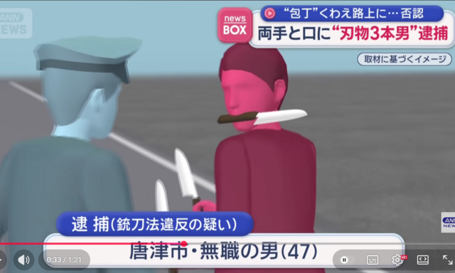 包丁のような刃物を右手と左手に1本ずつ持ち、さらに通報にはない3本目は、なんと刃物を口にくわえていたというのです。