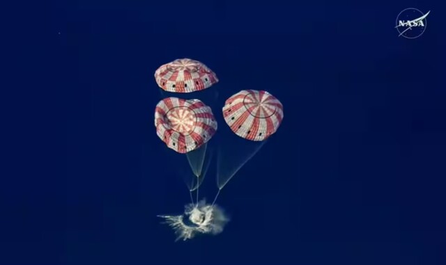 オリオンは同日午前8時53分ごろ、高度約120キロまで降下し、時速約4万キロで大気圏に再突入。同9時過ぎから順次パラシュートを開き、米カリフォルニア州沖の太平洋に着水した。