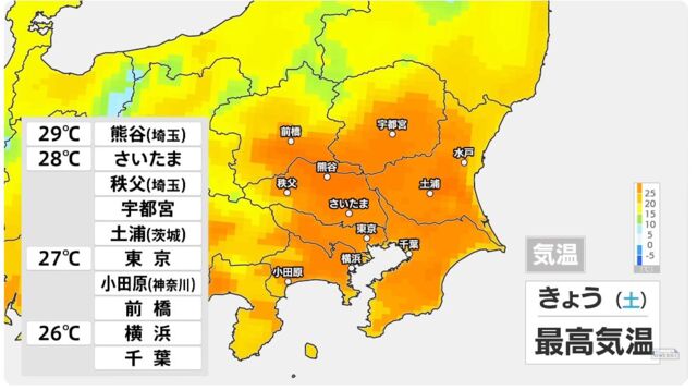 関東地方では気温が上がり、埼玉県北部で29度、栃木県南部や茨城県南部で28度など、真夏日に近い高温になると予想している。