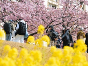 大勢の人たちが散策。足元では菜の花も咲き、ピンクと
