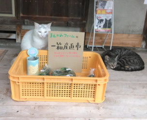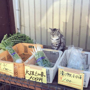 オーラのある猫さんが店番する「野菜の有猫販売」