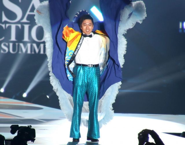 11月14日・15日に大阪初開催の「全国豊かな海づくり大会」ステージには、吉村知事が海をモチーフにした青色のユニークな衣装で登場。フード付きマントで顔と衣装を隠しながら、ステージを闊歩した。その後、ランウェイトップで勢いよくマントを外し、法被姿にチェンジ。大阪府広報担当副知事・もずやんとともに、満開の笑顔で観客に手を振り、堂々としたランウェイを披露した。