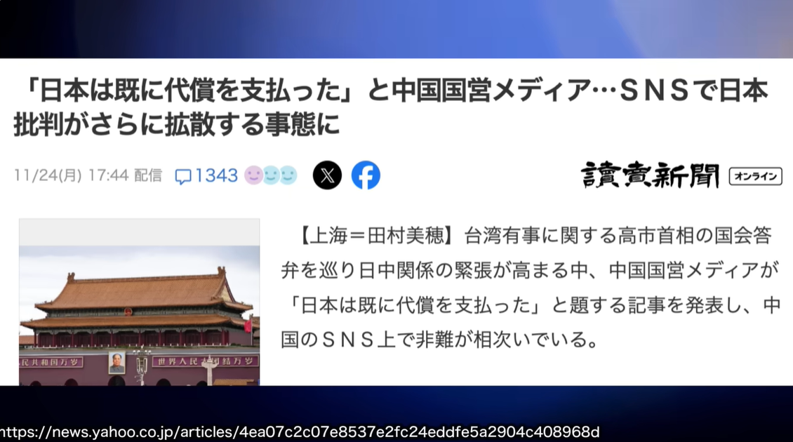 | 001 | 名無しさん | 2025/11/23(日) 19:23:37 | 高市総理の発言をめぐり日中関係が急速に悪 | 画像 |
