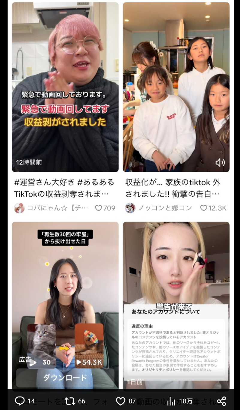 | 001 | 某コテハンさん | 2025/12/11(木) 12:29:21 | ◆収益化の剥奪を訴える日本人TikTok | 画像 |