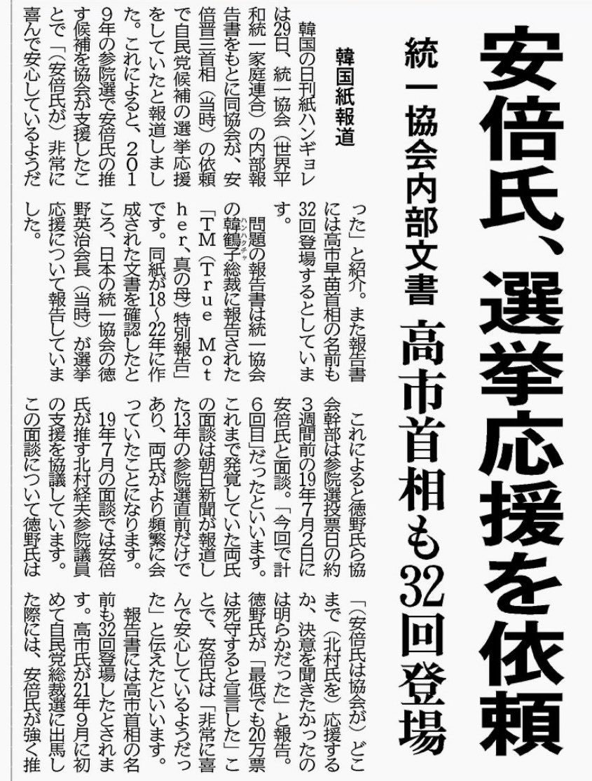 スレッドタイトル : 旧統一教会「自民だけで290人応援」と韓鶴子総裁に報告