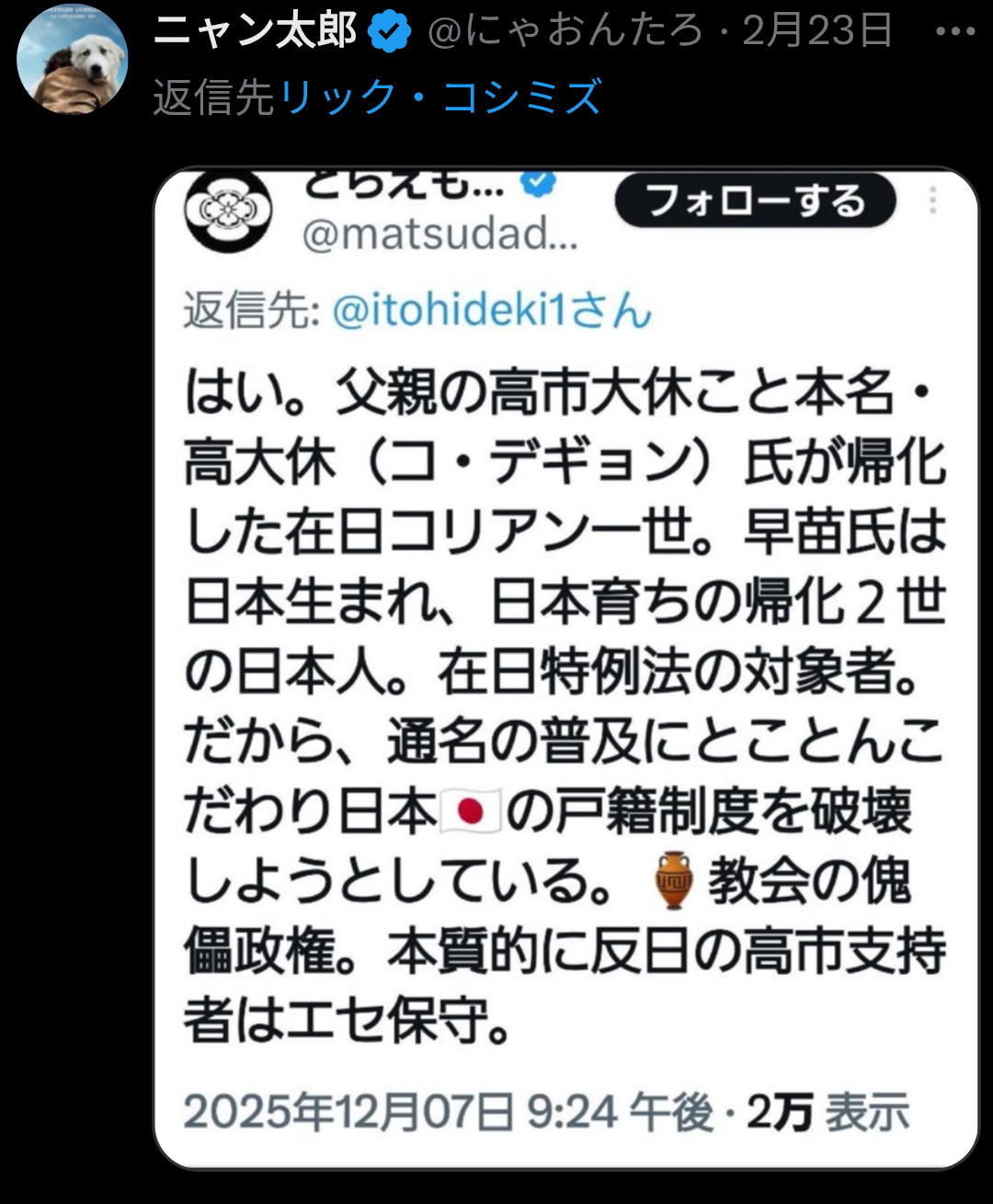 | 012 | 名無しさん | 2026/02/28(土) 07:42:05 | この人、日本人じゃなくて 日本人になりす | 画像なし |