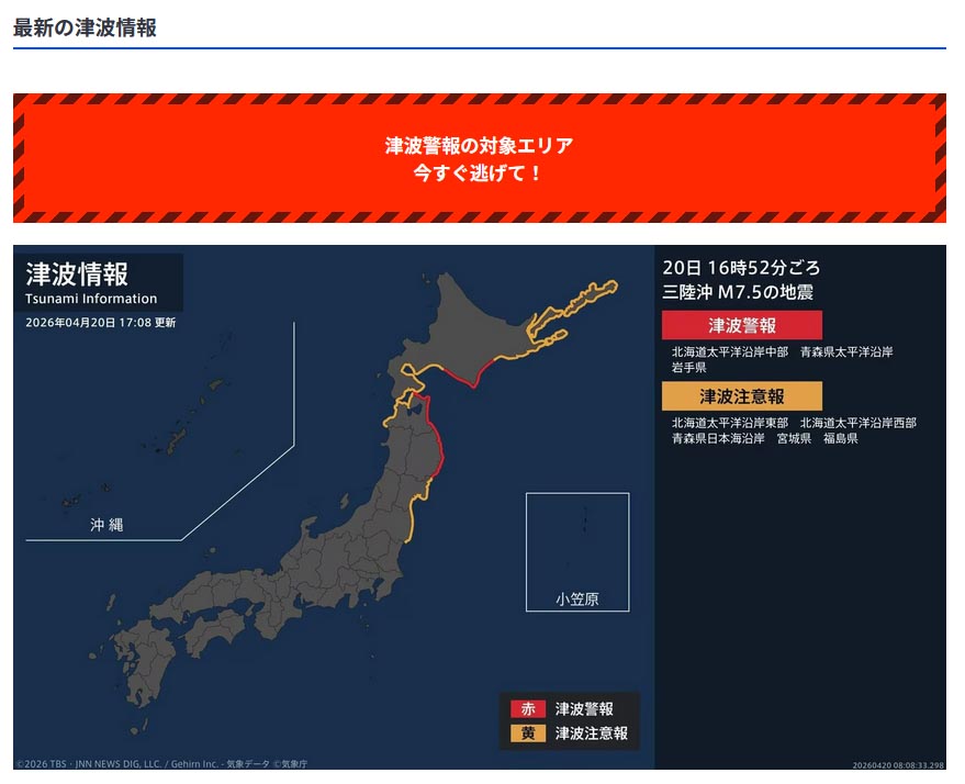 | 002 | 名無しさん | 2026/04/20(月) 17:28:27 | 最新の津波情報 | 画像 |