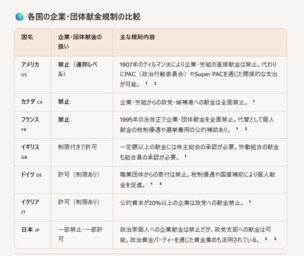 • 日本の課題:形式上の禁止がある一方で、政党支部やパーティー券購入を通じた実質的な企業献金が可能であり、透明性や実効性に課題が指摘されています。