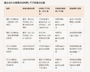 • 25年夏季規模(電気2.0〜2.4円/kWh、ガス8〜10円/m³)では、各月約▲0.3%ptの押し下げ効果が確認され、前年対比のエネルギー価格伸び率を「最大で約7%ポイント」抑えるとの推計がある。