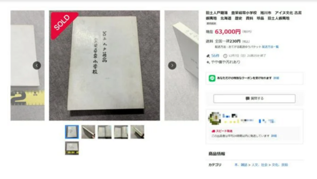 落札されたのは、表紙に「旧土人戸籍写 豊栄尋常小学校」と書かれた物で、今月7日に落札された。