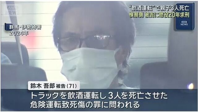 スレッドタイトル:伊勢崎市“飲酒運転”で親子3人死亡・被告男に懲役20年求刑
