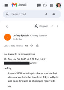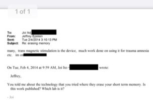 2014年のメールで、穰一はエプが試した短期記憶を消去する技術について尋ね、公表されているかどうか、どのラボのものかを知りたがった