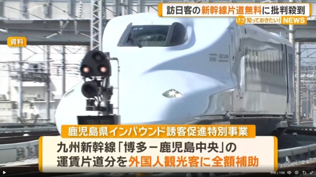 スレッドタイトル:鹿児島県 「訪日外国人の新幹線を片道無料」に批判殺到