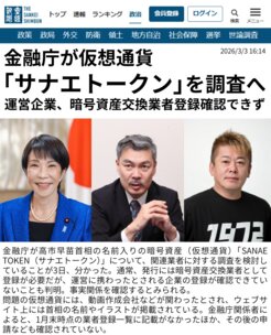 問題の仮想通貨には、動画作成会社などが関わったとされ、ウェブサイト上には首相の名前やイラストが掲載されている。金融庁関係者によると、1月末時点の業者登録一覧に記載がなかったほか、その後の申請なども確認されていない。日本向けで発行する場合に必要な取り扱い仮想通貨の一覧にも「SANAE TOKEN」の名前はなかったという。