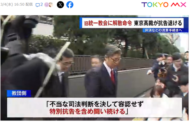 スレッドタイトル:旧統一教会に解散命令 東京高裁が抗告退ける 財産の清算手続きへ