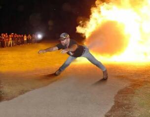「車が燃えながら走行している」 路上には燃えたイモ