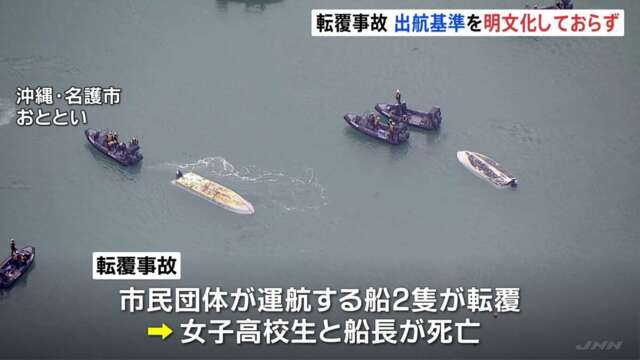 沖縄県名護市辺野古沖で平和学習中の同志社国際高(京都府)の生徒が乗った船2隻が転覆し、生徒ら2人が死亡した事故で、現場海域近くで進む米軍普天間飛行場(同県宜野湾市)の辺野古移設工事で、事故当日の気象・海象条件が大型作業船を使った作業中止基準を超えたため、作業を一部中止していたことが23日、関係者への取材で分かった。事故は23日で発生から1週間となった。