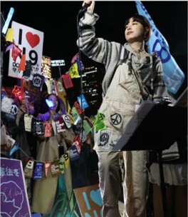 韓国の大統領退陣要求デモを参考にペンライトを振り、ドラムのリズムに合わせて「平和憲法 日本の宝」「改憲反対」などのコールをくり返した。