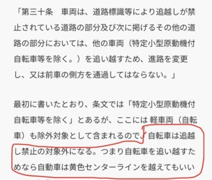 自転車等の追い越しにおいては」はみ出してもいいと判断されるが