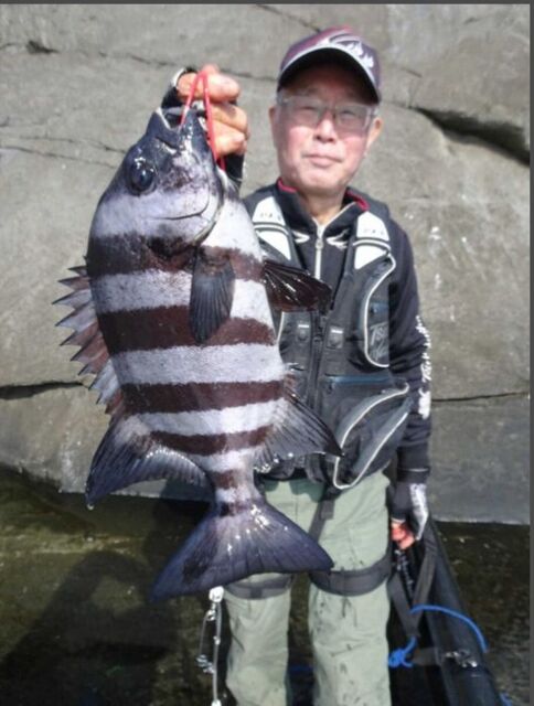 竿掛けに置いてからアタリを待つとコツンコツンと当たってくる。一度竿先が大きく押さえ込まれ戻る。「あっ離した」と思った直後にグーンと舞い込んだ。合わせを入れるとグングン引き込む。海中では白っぽい魚体が反転している。本命のイシダイだ。取りこぼしのないように磯上へ抜き上げると44センチのシマ模様の美しいイシダイだった。