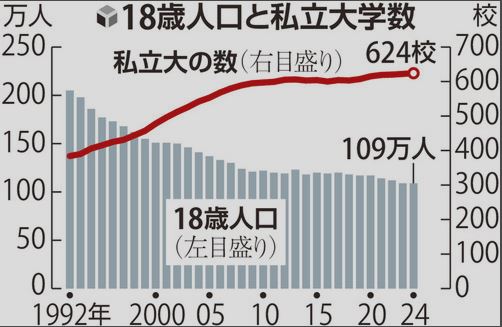 18歳人口は1992年の205万人から減少に転じ、2024年時点で109万人。この間、政府の規制緩和もあり私大は増え、1992年の384校から1・6倍になった。日本私立学校振興・共済事業団の2025年度調査では、私大の53%が定員割れに陥る。